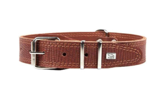 Двухслойный ошейник из тисненой натуральной кожи с тиснением, прошит декоративной строчкой, полукольцо посередине.