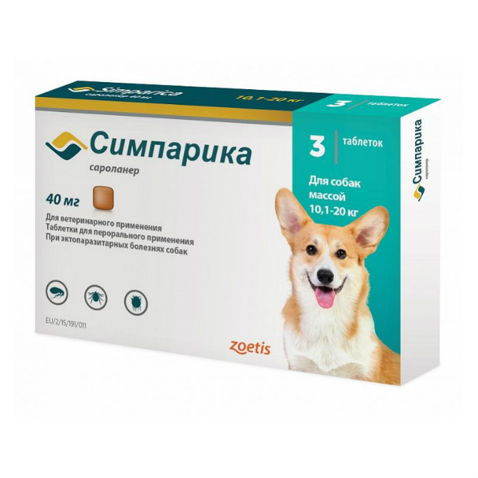 Симпарику выпускают в шести дозировках, содержащих в 1 таблетке в качестве действующего вещества сароланер 5, 10, 20, 40, 80 и 120 мг соответственно, а также вспомогательные вещества: лактозы моногидрат, карбоксиметил-крахмал натрия, кремния диоксид коллоидный, магния стеарат и вкусоароматическую гранулированную основу.