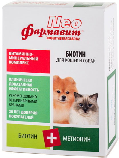 Биодоступные формы витамина Н и метионина нормализуют обмен веществ в организме, профилактируют гиповитаминоз Н и нарушения в развитии шерстного покрова животных. Витамин Н оказывает регулирующее влияние на нервную систему и состояние кожного покрова, способствует гладкости кожи и предотвращает её воспаление, обеспечивает здоровье, красоту, яркий окрас и пышность шерсти, препятствует выпадению шерсти. Метионин, благодаря наличию в своем составе серы, участвует в построении волоса, предупреждает шелушение и обесцвечивание шерстного покрова, являясь строительным материалом для всех протеинов, снижает мускульную вялость, уничтожает жировые субстанции и активирует гормоны и витамины.