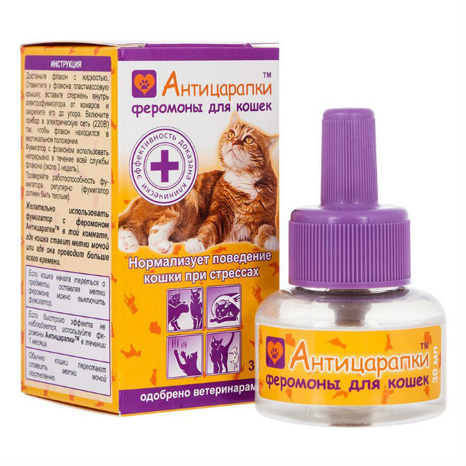 Феромоны 'Антицарапки' нормализуют поведение кошки и восстанавливают хорошее самочувствие при стрессе. Феромоны для кошек помогают справиться с такими проблемами, вызванными стрессом, как: - маркировка мочой и вертикальное царапанье - конфликты между кошками в группе - переезд в новый дом, ремонт, перестановка мебели - новый член семьи (ребенок, животное) - праздники, шум в доме - замкнутость, апатия. Эффективность феромонов для кошек доказана многочисленными клиническими испытаниями за рубежом. Флакон предназначен для использования с фумигатором.