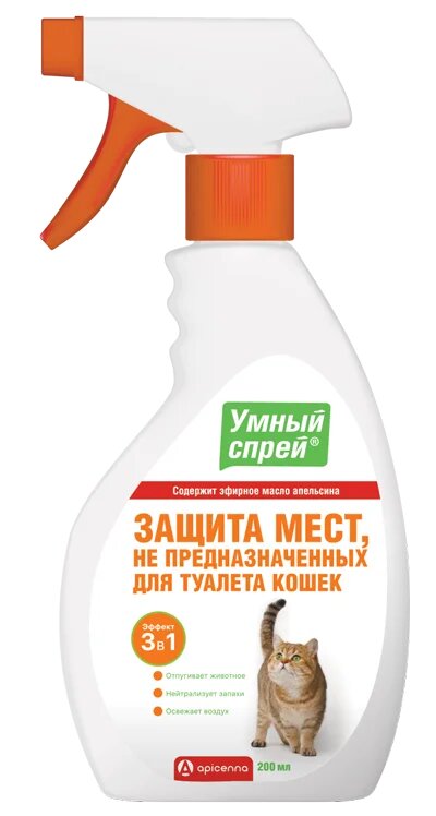 УМНЫЙ СПРЕЙ Защита мест, НЕ предназначенных для туалета кошек помогает отучить четвероногого питомца ходить в туалет в местах, не предназначенных для этого. Средство безвредно для людей и животных, не оставляет пятен, не повреждает обрабатываемые поверхности.