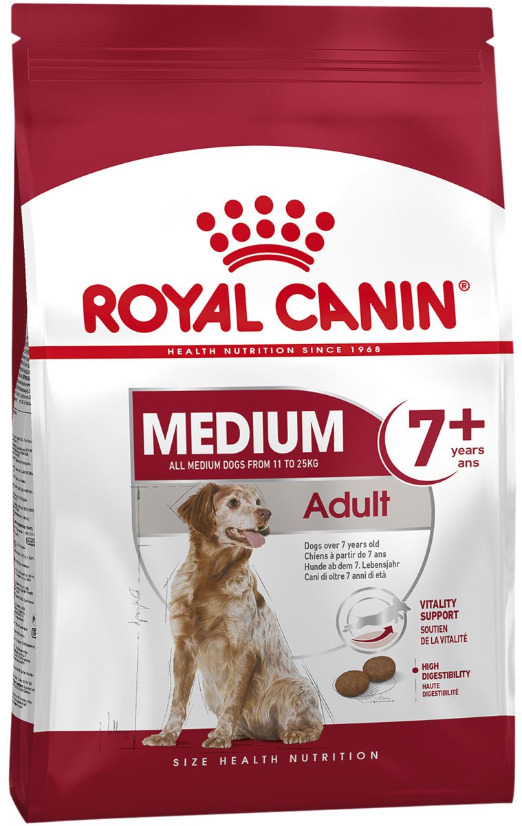 ROYAL CANIN® Medium Adult 7+ содержит все необходимые питательные вещества для поддержания здоровья собак пород среднего размера в зрелые годы, в период проявления первых признаков старения.