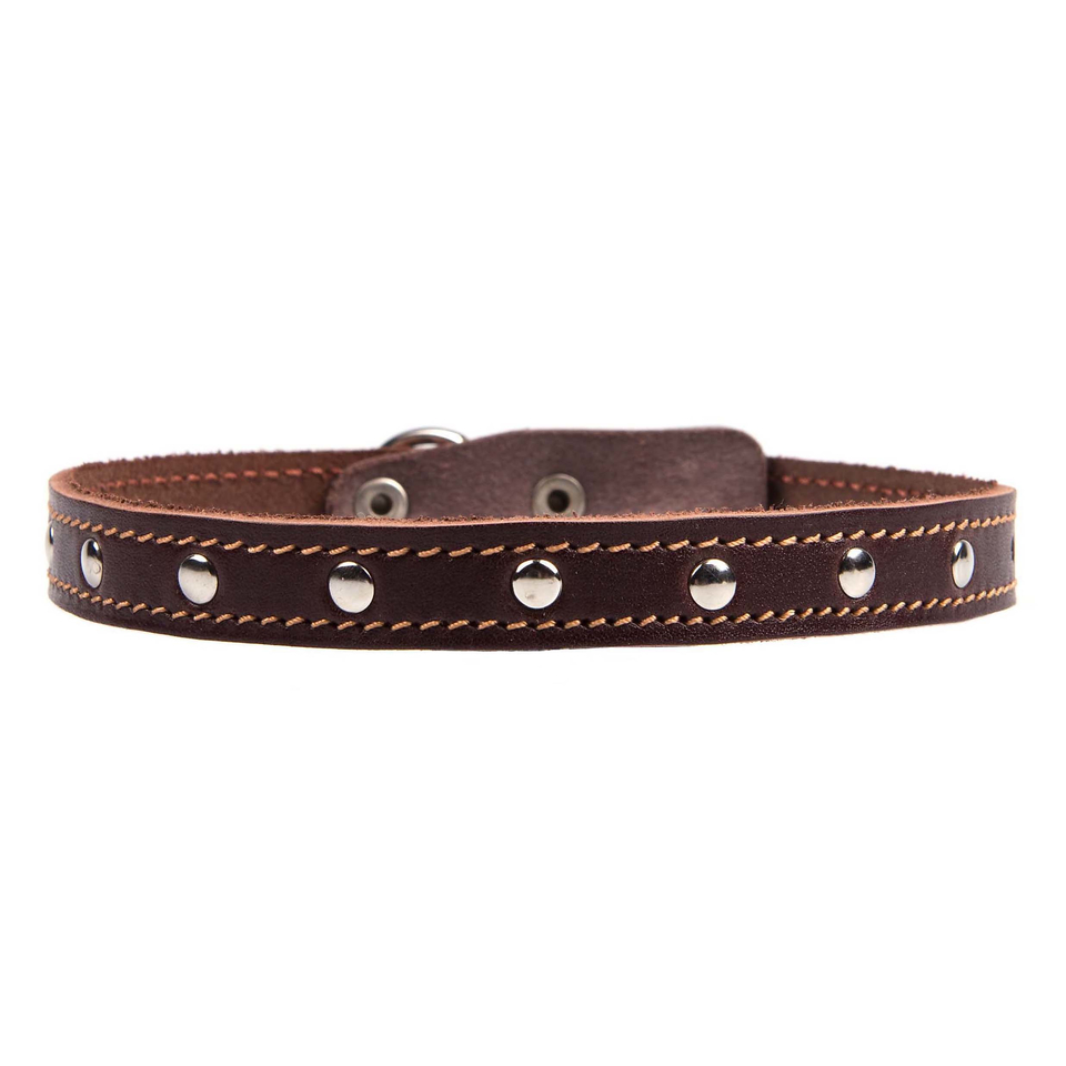 Однослойный ошейник из натуральной кожи, украшенный металлическими заклепками, прошит декоративной строчкой, полукольцо у пряжки.