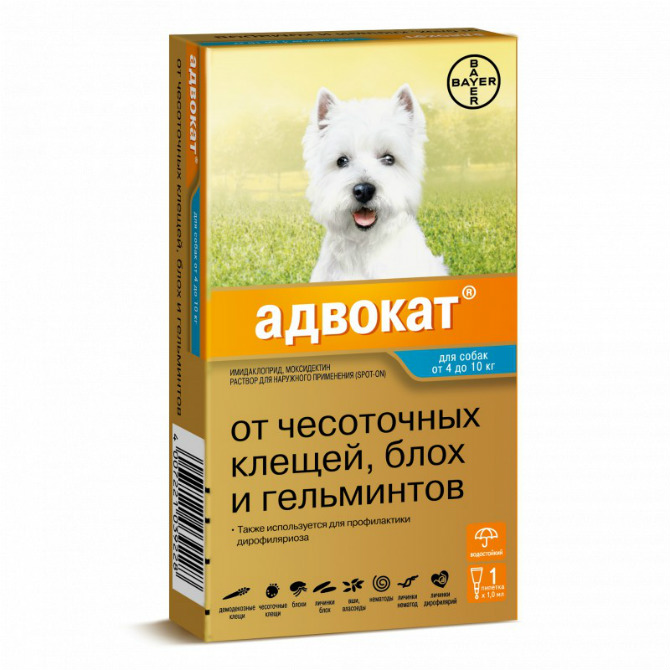 Комбинация, предложенная компанией Bayer, – имидаклоприд и моксидектин. · Имидаклоприд действует на внешних паразитов – вшей, взрослых блох, а также на личинок блох, находящихся в окружающей питомца среде. · Моксидектин действует на чесоточных клещей – подкожных и ушных, а также на внутренних паразитов – на круглых глистов.