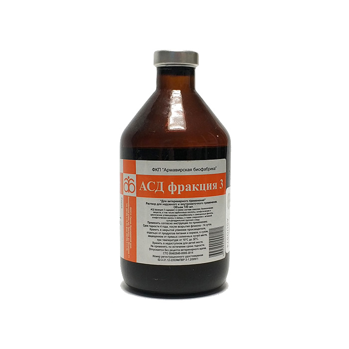 Препарат 'АСД-3Ф' применяют животным наружно в нативном виде или в виде 25-50% масляных растворов. Масляные растворы готовят в асептических условиях с использованием касторового, льняного, подсолнечного масел или рыбьего жира, которые при тщательном перемешивании добавляют 'АСД-3Ф' в соотношении 1:4 или 1:1. При лечении инфицированных вялозаживающих ран и свищей пораженный участок промывают 15-20% раствором препарата 'АСД-2Ф' до прекращения выделения гнойного экссудата и после этого накладывают марлевую салфетку, смоченную 20% масляным раствором препарата 'АСД-3Ф', которую фиксируют бинтом. Лечение проводят до выздоровления, ежедневно заменяя салфетки с препаратом, но не более 21 суток. При экземах, пролежнях, дерматитах, хронических воспалительных поражениях кожи, пиодермии и трофических язвах на пораженные участки кожи наносят 25-50% масляные растворы препарата один раз в сутки, захватывая 2-3 см здоровой кожи (с целью предупреждения распространения очага воспаления). Лечение проводят до выздоровления животного, но не более 21 суток. При обширных поражениях 50%-й раствор препарата наносят попеременно на разные участки, покрывая за одну обработку не более 10% поверхности тела животного. При некробактериозе животных и копытной гнили овец после соответствующего туалета пораженные участки смазывают 'АСД-3Ф' в нативном виде один раз в день. Лечение проводят в комплексе с местными хирургическими обработками и лекарственными средствами специфической и симптоматической терапии до полного выздоровления животного, но не более 28 суток.