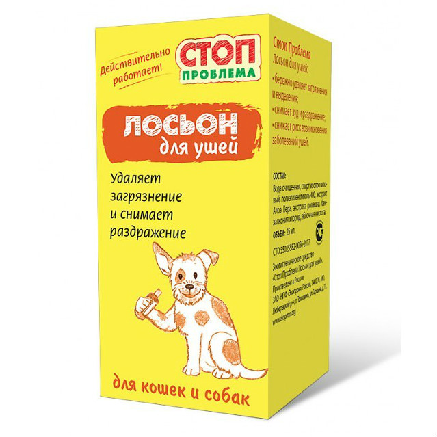 Стоп Проблема Лосьон для ушей: - бережно удаляет загрязнения и выделения; - снимает зуд и раздражение; - снижает риск возникновения заболеваний ушей. Стоп Проблема Лосьон для ушей применяют кошкам, собакам, котятам, щенкам, хорькам и кроликам для гигиенической обработки ушной раковины, наружного слухового прохода, а также перед применением ушных капель и мазей. В качестве вспомогательного средства при лечении отитов разной этиологии.