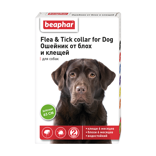 Ошейник от блох и клещей для собак с шестимесячного возраста. Цвет зеленый. Уничтожает паразитов и защищает от повторного заражения блохами и клещами в течение 6 месяцев. Диазинон в составе ошейника обладает несистемным действием. Диазинон выделяется с поверхности ленты, переносится на кожно-волосяной покров животного и накапливается в эпидермисе, волосяных луковицах, сальных железах. Постепенно высвобождаясь на поверхность кожи вместе с секретом желез, диазинон оказывает контактное инсектоакарицидное и репеллентное действие на половозрелые и неполовозрелые фазы развития блох, вшей, власоедов и клещей, паразитирующих на животных. Механизм действия диазинона заключается в ингибировании активности холинэстеразы и стимуляции холинергических процессов в организме клещей, блох, вшей и др., в результате чего происходят паралич и гибель эктопаразитов.