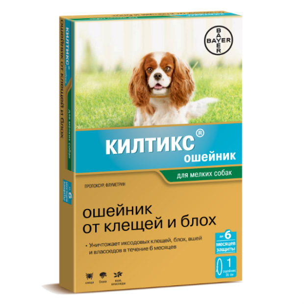 Ошейник Килтикс®- продукт, помогающий вам защитить собаку от клещей и блох на протяжении 6 месяцев. Носить ошейник рекомендовано постоянно. Просто наденьте ошейник на собаку. Препарат немецкого производителя Bayer.