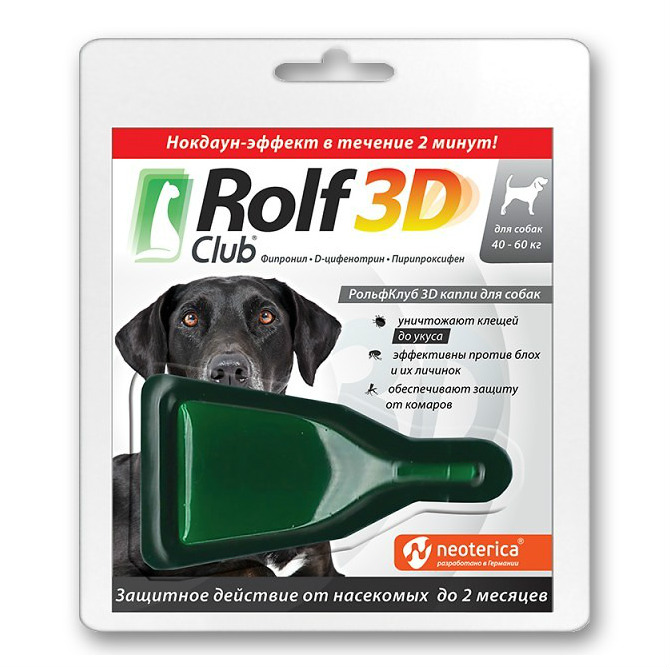 РольфКлуб 3D капли для собак применяют собакам однократно путем точечного («spot on») нанесения на кожу. Кончик тюбик-пипетки предварительно отрезают ножницами. Лекарственный препарат, раздвинув шерсть, наносят на сухую неповрежденную кожу в области шеи у основания черепа или между лопатками (в места, недоступные для слизывания животным). В случае наличия присосавшихся клещей и паразитирующих насекомых, открепление и гибель их наступает в течение 1-2 часа после обработки. Продолжительность защитного действия от иксодовых клещей после однократной обработки сохраняется в течение 30 дней, против насекомых – до 2-х месяцев, репеллентное действие против летающих кровососущих насекомых – в течение 7 суток.