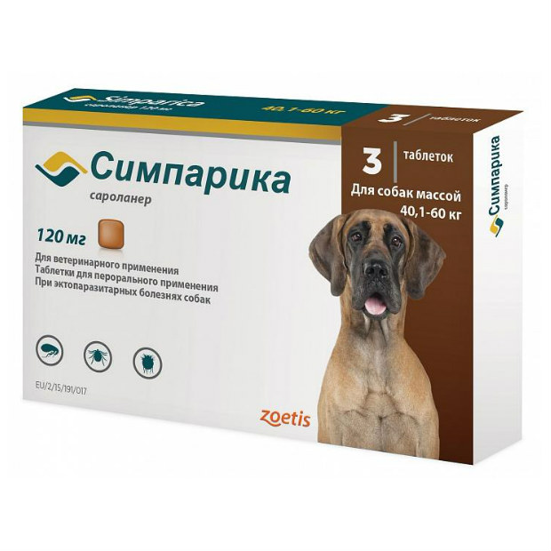 Симпарику выпускают в шести дозировках, содержащих в 1 таблетке в качестве действующего вещества сароланер 5, 10, 20, 40, 80 и 120 мг соответственно, а также вспомогательные вещества: лактозы моногидрат, карбоксиметил-крахмал натрия, кремния диоксид коллоидный, магния стеарат и вкусоароматическую гранулированную основу.