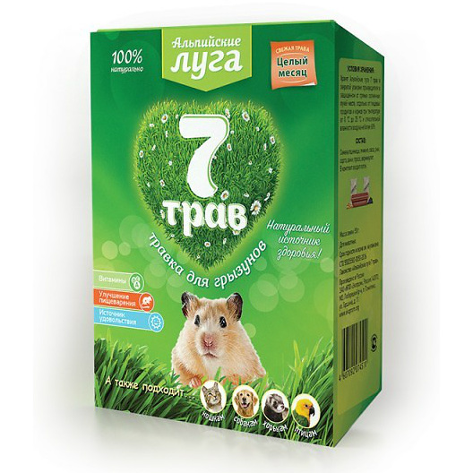 'Альпийские Луга 7 трав' содержит специально подобранные травы из 7 видов растений, которые нормализуют обменные процессы в организме животного, в том числе пищеварительные, являются естественным источником клетчатки, углеводов, витаминов группы В, витаминов Е, Н, РР, минералов, незаменимых жирных кислот, каротина; стимулируют процессы очищения желудка от шерсти.